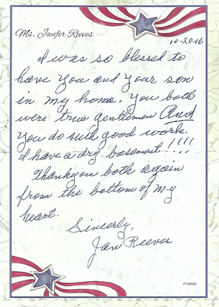 I was so blessed to have you and your son in my home. You both were true gentlemen and you do such good work. I have a dry basement!!!!