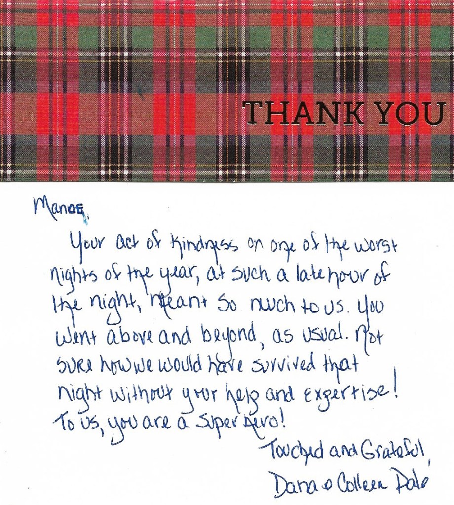 Mance, Your act of kindness on one of the worst nights of the year, at such a late hour of the night, meant so much to us. You went above and beyond, as usual…